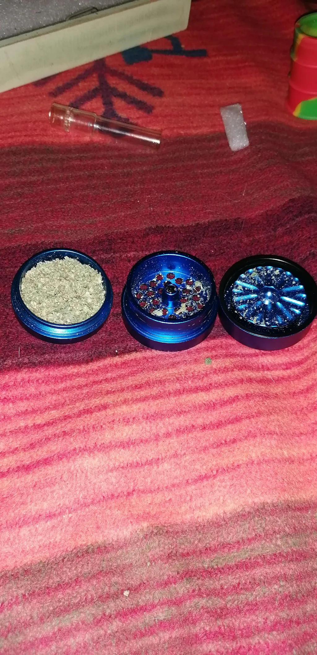 Remove the top and pop some herb on the mill plate. Herb doesn't need to be broken up as long as it sits below the top of the mill, if you're working with a little more, break it up a little so that the top piece with the milling rotor sits evenly.