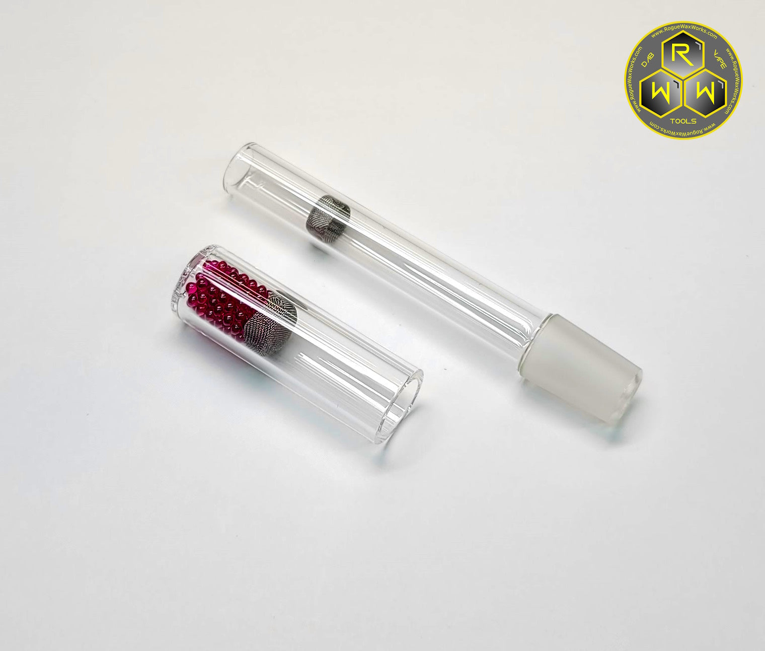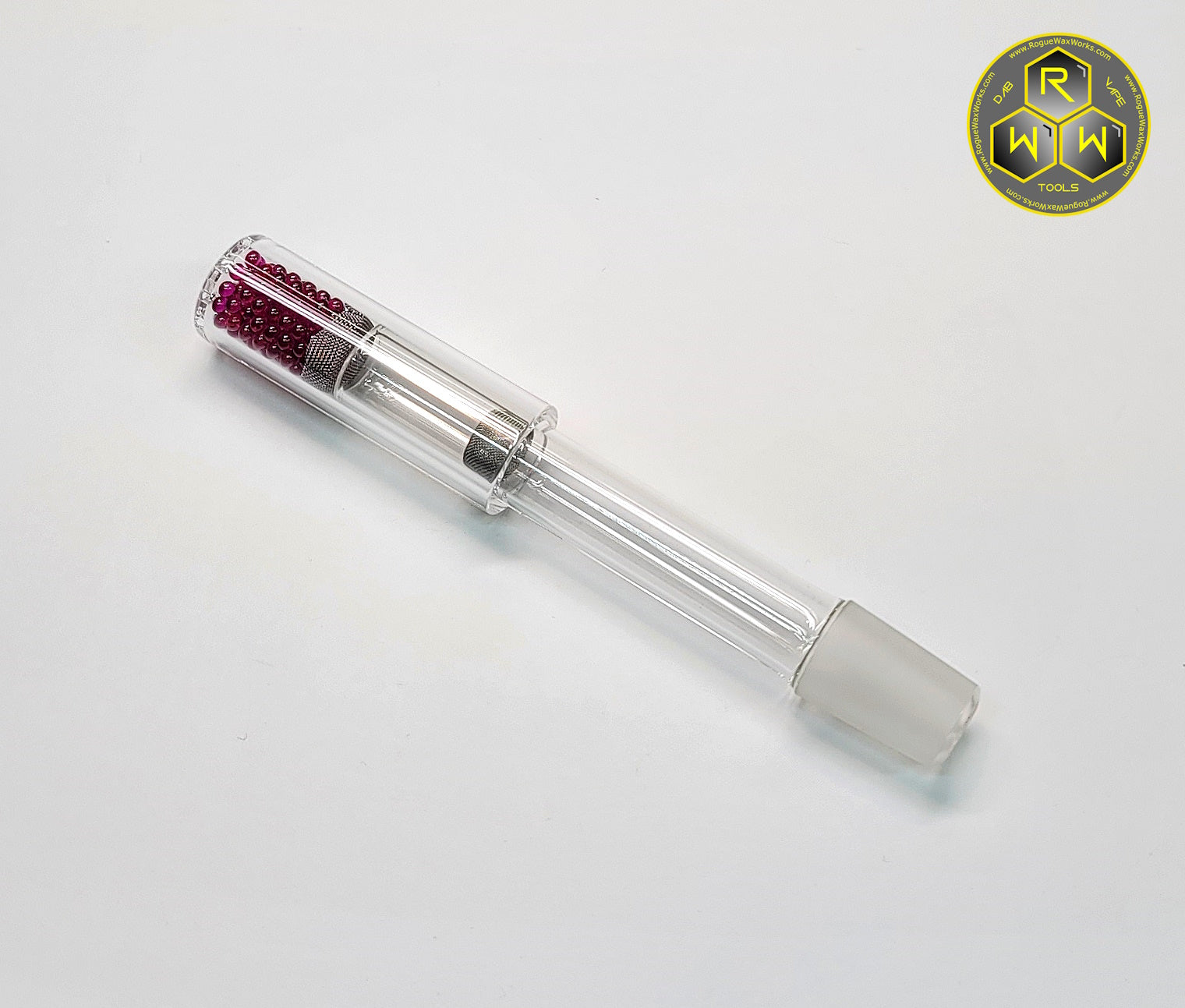 The "QR Baller" is The Rogue Wax Works' answer to a ball vape. Like the other RWW devices it makes use of a Quartz Heater and Glass Bowl, with the only metal in the airpath being the Stainless Steel mesh screens. Unlike the other RWW devices, this one has a heater filled with Ruby balls!