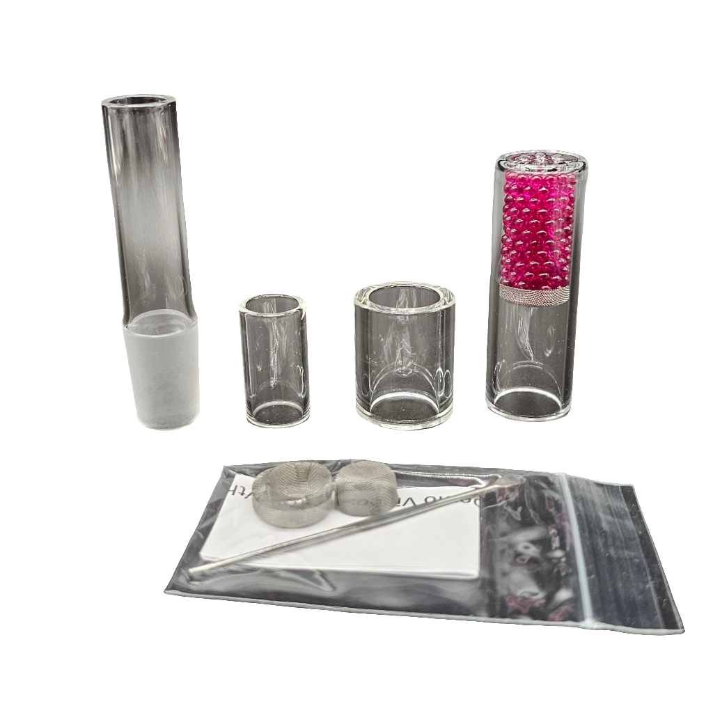 Comes assembled as shown with bowl screens, Ruby retention screens, Quartz Housing, 300 x 3mm Rubies and 2 glass tubes that are part of the rebuild kit.